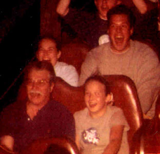 Having already spent many days torturing Malorie with long car rides with the Smigelskis, several family dinners, and crummy weather for Florida, the family takes her on a wooden roller coaster at Busch Gardens. In the original photograph, Dad looks like he might cry, Caitlin looks like she is ready to go to sleep, Malorie's eyes are almost closed, and Owen could fit an entire apple in his mouth. |