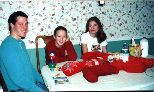 Owen, Caitlin and Malorie opening their stockings from Santa on Christmas Day. Malorie now has become one of the Smigelski kids, as she experiences their yearly torture of being filmed and photographed while posing with their stockings. Caitlin is having problems hiding her annoyance; Owen is too tired to react. |