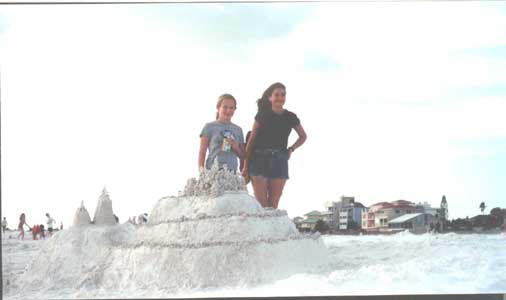 Caitlin and Malorie pose in front of a sand castle, while Owen (the photographer) attempts to be artistic with the camera angle. | ![]() |